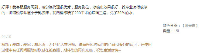 (天貓網友)好評!贊客服服務周到,哈爾濱代理很優秀,服務到位,漆噴出效果很好,找專業師傅噴涂的,師傅說漆味道小于乳膠漆,我兩桶漆噴了200平米的墻面三遍。兌了30%的水。
